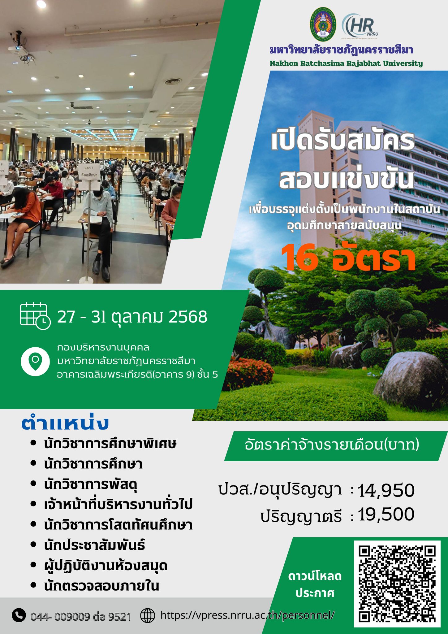 มหาวิทยาลัยราชภัฏนครราชสีมา รับสมัครสอบแข่งขันบุคคลเพื่อจ้างเป็นพนักงานในสถาบันอุดมศึกษาสายสนับสนุน จำนวน 16 อัตรา