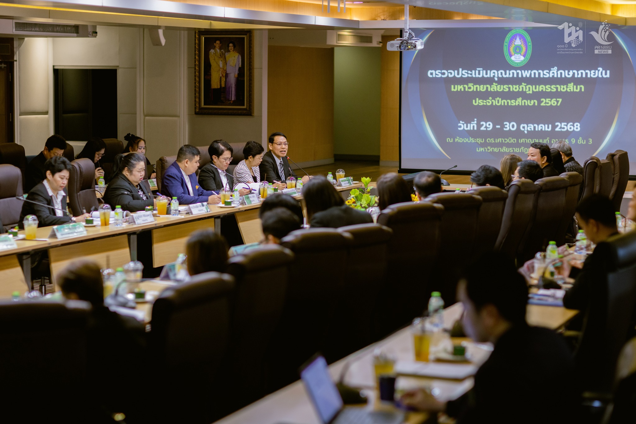 วันที่ 29 ตุลาคม 2568 มหาวิทยาลัยราชภัฏนครราชสีมา ได้เข้ารับการตรวจประเมินคุณภาพการศึกษาภายในระดับมหาวิทยาลัย ประจำปีการศึกษา 2567 ณ ห้องประชุม ดร.เศาวนิต เศาณานนท์ ซึ่งก่อนเริ่มการตรวจประเมิน คณะกรรมการบริหารมหาวิทยาลัย พร้อมด้วย คณะกรรมการตรวจประเมินคุณภาพการศึกษาภายในระดับมหาวิทยาลัย คณาจารย์และบุคลากร ได้ยืนสงบนิ่งเพื่อถวายความอาลัยแด่ สมเด็จพระนางเจ้าสิริกิติ์ พระบรมราชินีนาถ พระบรมราชชนนีพันปีหลวง จากนั้น ผู้ช่วยศาสตราจารย์ ดร.ประจักร์ รอดอาวุธ ประธานกรรมการฯ แนะนำคณะกรรมการประเมินชี้แจงวัตถุประสงค์ของการประเมิน และวิธีการประเมินต่อด้วย รองศาสตราจารย์ ดร. อดิศร เนาวนนท์ อธิการบดีรายงานผลการดำเนินงานของมหาวิทยาลัยในรอบ ปีการศึกษา 2567