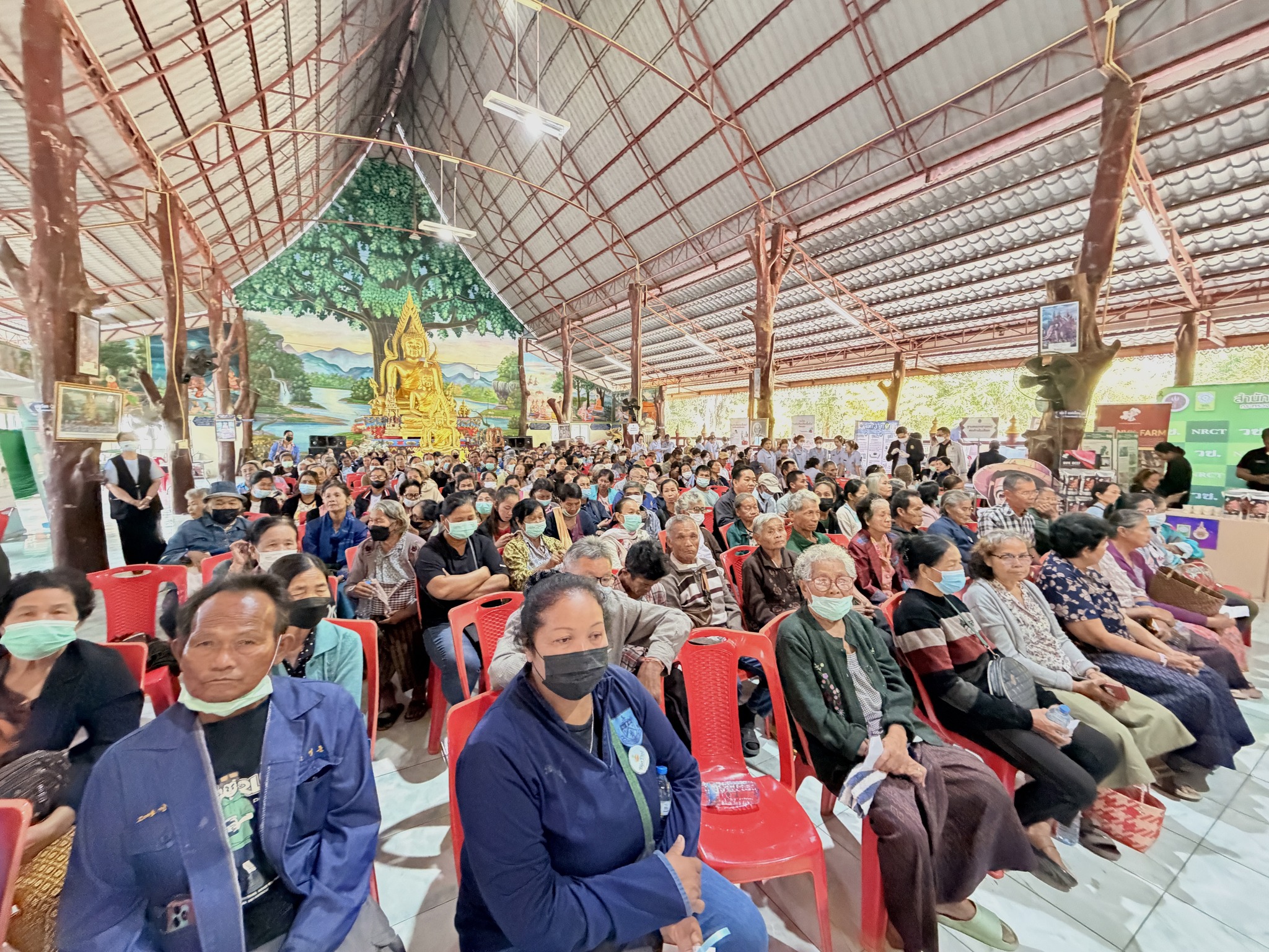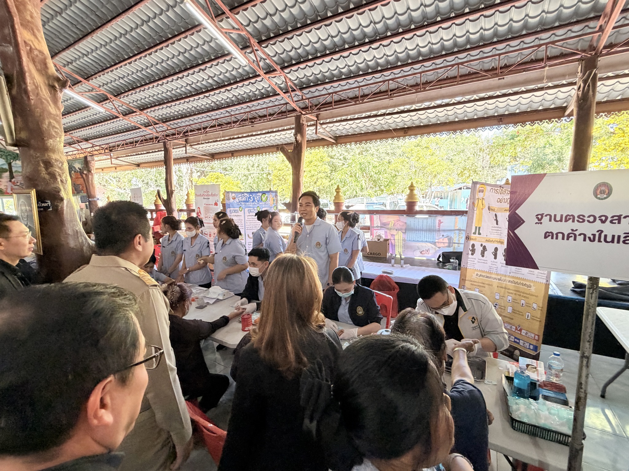 วันที่ 15 ธันวาคม 2568 มหาวิทยาลัยราชภัฏนครราชสีมา ให้การต้อนรับการลงพื้นที่ติดตามการดำเนินงานของกระทรวงการอุดมศึกษา วิทยาศาสตร์ วิจัยและนวัตกรรม ( กระทรวง อว.) ณ วัดหลุ่มประดู่ อำเภอห้วยแถลง และ วัดป่าหนองบัวเกาะเพชร อำเภอจักราช จังหวัดนครราชสีมา โดยมี ศาสตราจารย์ ดร.ศุภชัย ปทุมนากุล ปลัดกระทรวง อว. เป็นประธานในการลงพื้นที่ติดตามการดำเนินงาน ในการนี้มี นายอนุพงศ์ สุขสมนิตย์ ผู้ว่าราชการจังหวัดนครราชสีมา กล่าวต้อนรับ พร้อมด้วย คณะกรรมการบริหารมหาวิทยาลัยราชภัฏนครราชสีมาให้การสนันบสนุนการจัดกิจกรรม ในการลงพื้นที่ครั้งนี้ มหาวิทยาลัยราชภัฏนครราชสีมาได้มีการตั้งจุดบริการตรวจสุขภาพให้กับประชาชน ประกอบด้วย การถ่ายทอดองค์ความรู้เรื่องพยาธิใบไม้ในตับ , การตรวจคัดกรองและถ่ายทอดองค์ความรู้มะเร็งเต้านม โดยคณะพยาบาลศาสตร์ พร้อมด้วย การตรวจคัดกรองโรค NCD (เบาหวาน ความดัน) และการตรวจสารเคมีกำจัดศัตรูพืชในร่างกาย โดย คณะสาธารณสุขศาสตร์ และ การบริการซ่อมเครื่องใช้ไฟฟ้าและเปลี่ยนถ่ายน้ำมันเครื่อง รถจักรยานยนต์ โดยคณะเทคโนโลยีอุตสาหกรรม พร้อมกันนี้ยังมีการจัดแสดงนิทรรศการนวัตกรรมการพัฒนาผลิตภัณฑ์ โดยมหาวิทยาลัยราชภัฏนครราชสีมา ได้นำผลงานวิจัยและนวัตกรรมจากกองทุน ววน. : การส่งเสริม Creative Economy ผ่านงานหัตถกรรมท้องถิ่น และการยกระดับสินค้าเกษตร มันสำปะหลังและข้าว และ โครงการพัฒนาและยกระดับแพลตฟอร์มเพื่อการแก้ไขปัญหาความยากจน