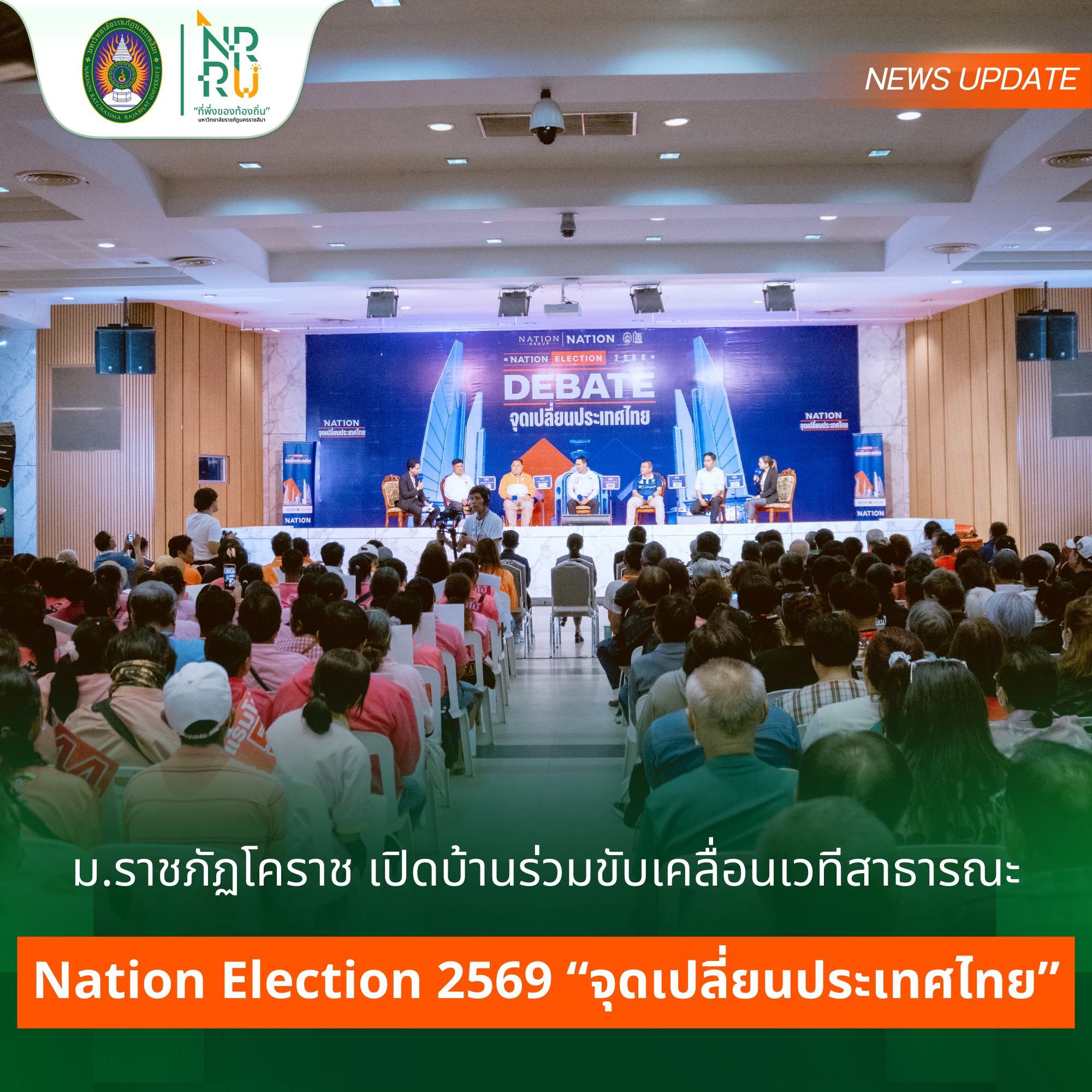 วันที่ 28 มกราคม 2569 มหาวิทยาลัยราชภัฏนครราชสีมา เป็นสถานที่เปิดเวทีสาธารณะ โครงการ Nation Election 2569 “จุดเปลี่ยนประเทศไทย” เวทีภูมิภาค จังหวัดนครราชสีมา โดยมี รองศาสตราจารย์ ดร. อดิศร เนาวนนท์ อธิการบดีมหาวิทยาลัยราชภัฏนครราชสีมา พร้อมด้วย รองอธิการบดี เข้าร่วมกิจกรรม ณ หอประชุมอนุสรณ์ 70 ปี มหาวิทยาลัยราชภัฏนครราชสีมา ซึ่งกิจกรรมครั้งนี้ จัดโดย บริษัท เนชั่น กรุ๊ป ในฐานะองค์กรสื่อที่ยืนหยัดเคียงข้างสังคมไทย มีภารกิจในการนำเสนอข้อมูลข่าวสารอันเป็นประโยชน์ต่อสังคม และส่งเสริมกระบวนการประชาธิปไตยอย่างสร้างสรรค์