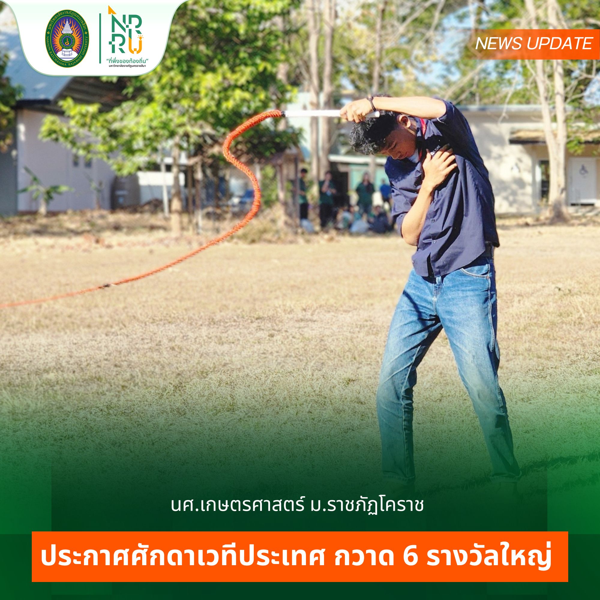 นักศึกษาสาขาวิชาเกษตรศาสตร์ คณะวิทยาศาสตร์และเทคโนโลยี มหาวิทยาลัยราชภัฏนครราชสีมา สร้างชื่อเสียงและความภาคภูมิใจให้กับมหาวิทยาลัย ด้วยการประกาศชัยชนะคว้า 6 รางวัลใหญ่ จากการแข่งขัน “ทักษะวิชาการและวิชาชีพทางการเกษตรเครือข่ายราชภัฏทั่วประเทศ ครั้งที่ 11” ภายใต้แนวคิด“ราชภัฏรวมพลัง สร้างสรรค์เกษตรยุคใหม่ ก้าวไกลด้วยเทคโนโลยี” ระหว่างวันที่ 3–6 กุมภาพันธ์ 2569 ณ มหาวิทยาลัยราชภัฏสกลนคร โดยมีนักศึกษาจากเครือข่ายมหาวิทยาลัยราชภัฏทั่วประเทศเข้าร่วมแข่งขันอย่างคับคั่ง เพื่อแสดงศักยภาพด้านความรู้ทางวิชาการ ควบคู่ทักษะวิชาชีพด้านการเกษตรอย่างเข้มข้น . สำหรับรางวัลที่นักศึกษามหาวิทยาลัยราชภัฏนครราชสีมาได้รับในครั้งนี้ ประกอบด้วย 1. นายธนานุวัต นากกระโทก และ นายวชิรวิทย์ ทองกระโทก ได้รับรางวัล รองชนะเลิศอันดับ 1 การตอบปัญหาทางวิชาการ สาขาสัตวศาสตร์ 2. นายภูริณัฐ คงสัตย์ ได้รับรางวัล รองชนะเลิศอันดับ 1 การแข่งขันทักษะสะบัดแส้ 3. นายปุณณพัฒน์ ถาดครบุรี และ นายณัฐพล สงค์เวียง ได้รับรางวัล รองชนะเลิศอันดับ 1 การแข่งขันทักษะบรรจุถุงปลา 4. นางสาวรินรดา บำรุงกลา และ นายสุริยัณห์ คำดี ได้รับรางวัล รองชนะเลิศอันดับ 1 การแข่งขันทักษะแยกเพศปลา 5. นายธนานุวัต นากกระโทก นายทวีป สังข์เลขา นายธนากร สุดแสง และนายกิตตินันท์ นิลศิริ ได้รับรางวัล รองชนะเลิศอันดับ 2 การประกวดแผนธุรกิจเกษตร 6. นายทวีป สังข์เลขา นายภูริณัฐ คงสัตย์ นายฐิติพงศ์ หอมหวล และนางสาวรินรดา บำรุงกลาง ได้รับรางวัล รองชนะเลิศอันดับ 2 การแข่งขันทักษะคล้องและล้มโค . ความสำเร็จดังกล่าวสะท้อนถึงศักยภาพ ความแข็งแกร่งทางวิชาการ และทักษะวิชาชีพด้านการเกษตรของนักศึกษาอย่างรอบด้าน โดยมี อาจารย์รัชนีกร มูลปา ทำหน้าที่เป็นอาจารย์ผู้ฝึกสอน ถ่ายทอดองค์ความรู้และเสริมสร้างประสบการณ์เชิงปฏิบัติอย่างใกล้ชิด . ความสำเร็จในครั้งนี้นับเป็นอีกหนึ่งบทพิสูจน์คุณภาพการจัดการเรียนการสอนของสาขาวิชาเกษตรศาสตร์ คณะวิทยาศาสตร์และเทคโนโลยี มหาวิทยาลัยราชภัฏนครราชสีมา ที่มุ่งผลิตบัณฑิตนักปฏิบัติ พร้อมก้าวสู่การเป็นกำลังสำคัญในการพัฒนาเกษตรไทยสู่ยุคใหม่อย่างยั่งยืน