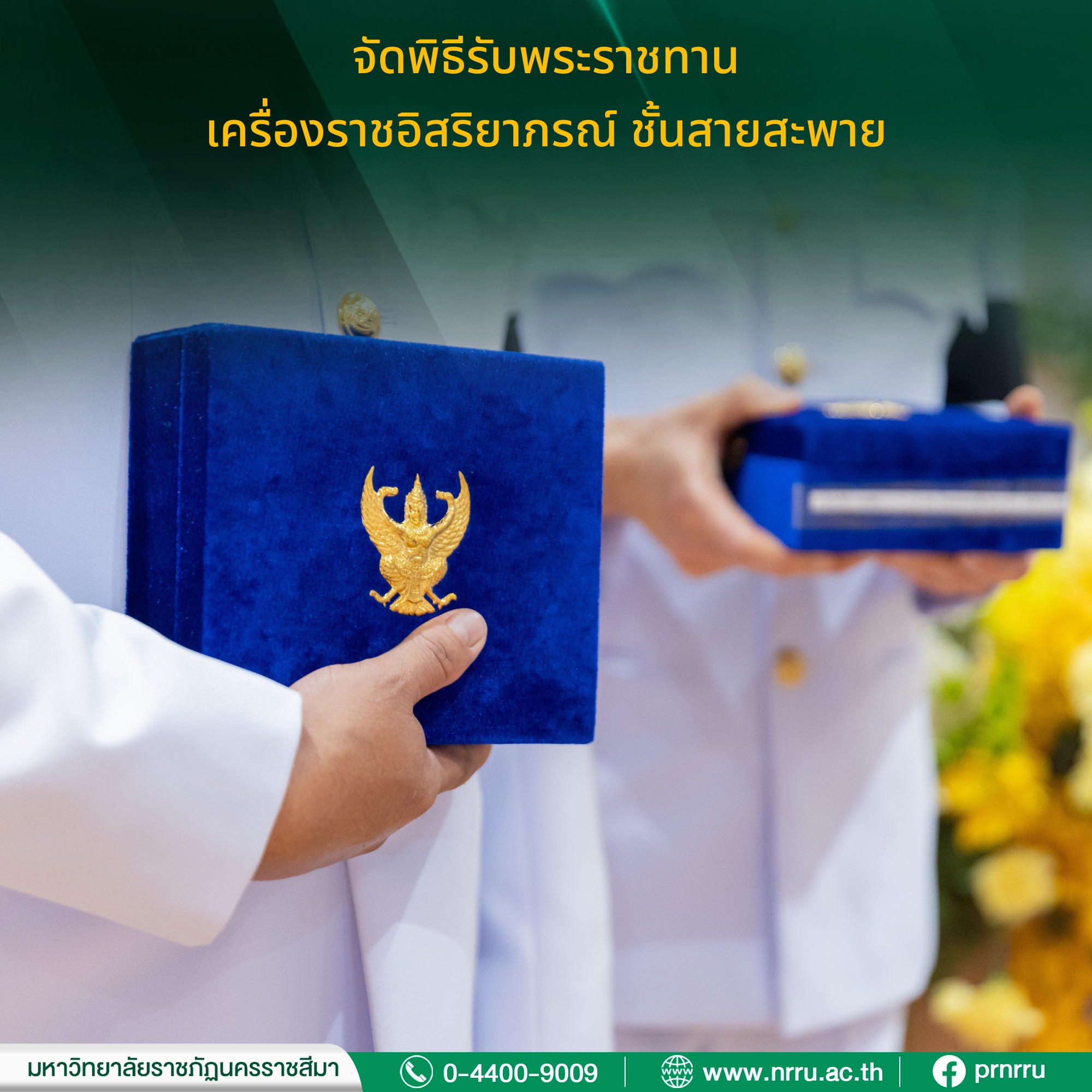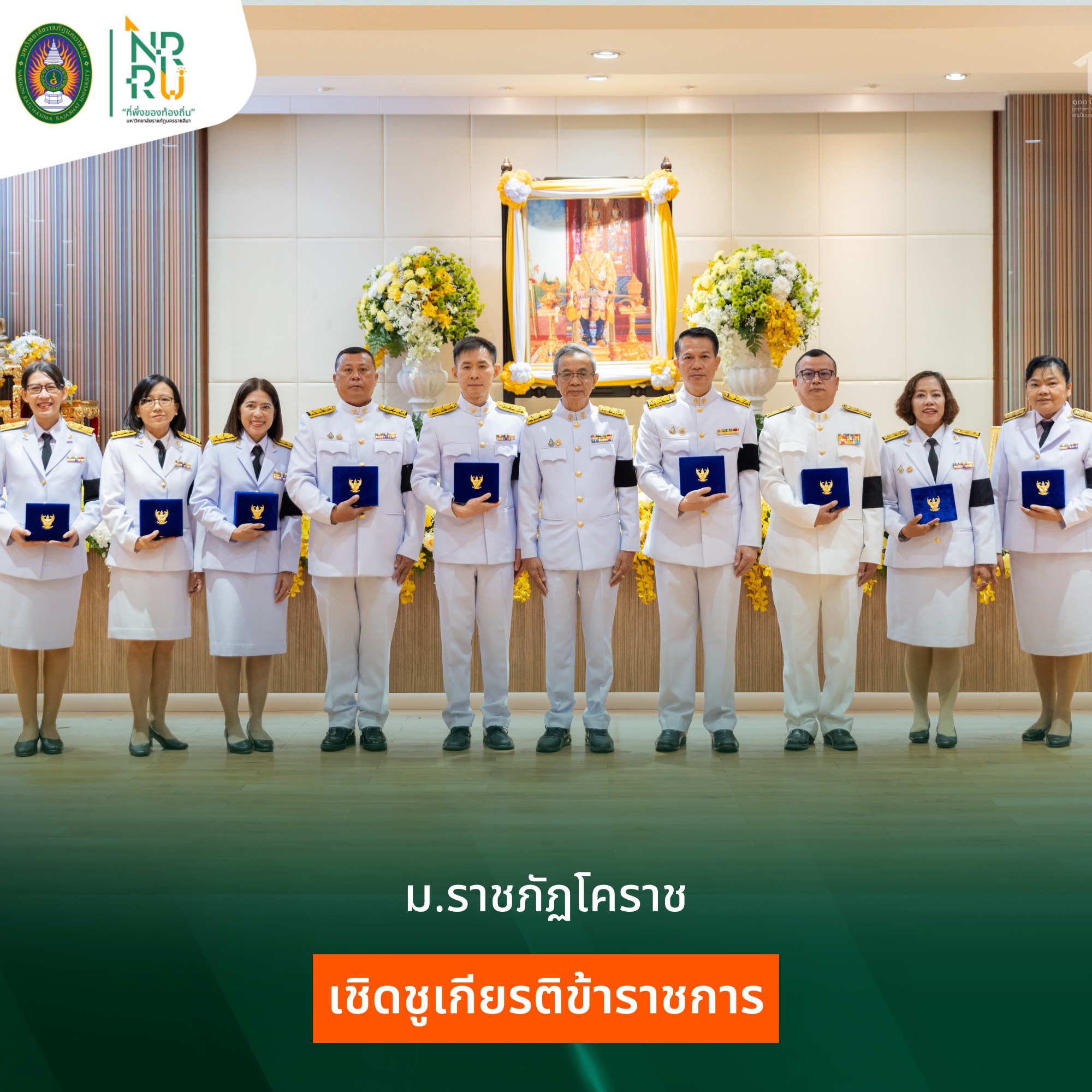 วันที่ 12 กุมภาพันธ์ 2569 ณ ห้องประชุมสระบัว ชั้น 1 อาคารราชภัฏรังสฤษฏ์ มหาวิทยาลัยราชภัฏนครราชสีมา จัดพิธีรับพระราชทานเครื่องราชอิสริยาภรณ์ ชั้นสายสะพาย ประจำปี 2567 ในโอกาสพระบาทสมเด็จพระเจ้าอยู่หัว ทรงพระกรุณาโปรดเกล้าโปรดกระหม่อมพระราชทานเครื่องราชอิสริยาภรณ์ ชั้นตราประถมาภรณ์มงกุฎไทย ชั้นสายสะพาย เพื่อเชิดชูเกียรติให้กับข้าราชการในสังกัด มหาวิทยาลัยราชภัฏนครราชสีมา จำนวน 9 ราย ในการนี้ มหาวิทยาลัยราชภัฏนครราชสีมา ได้จัดพิธีรับพระราชทานเครื่องราชอิสริยาภรณ์ โดยมี รองศาสตราจารย์ ดร.อดิศร เนาวนนท์ อธิการบดี เป็นประธานในพิธี พร้อมด้วย ผู้ช่วยศาสตราจารย์ ดร.รัฐกรณ์ คิดการ รองอธิการบดีฝ่ายทรัพยากรบุคคลและกฏหมาย เป็นผู้กล่าวรายงานและเบิกตัวผู้เข้ารับพระราชทานเครื่องราชอิสริยาภรณ์ จากนั้นข้าราชการในสังกัดมหาวิทยาลัยราชภัฏนครราชสีมาเข้ารับพระราชทาน เครื่องราชอิสริยาภรณ์หน้าพระบรมฉายาลักษณ์ตามลำดับ และประธานในพิธีกล่าวแสดงความยินดีกับผู้เข้ารับพระราชทานเครื่องราชอิสริยาภรณ์ทุกท่าน ว่าวันนี้การได้รับพระมหากรุณาธิคุณ ที่ทรงพระราชทานเครื่องราชอิสริยาภรณ์ ถือว่าเป็นมงคลและมีคุณค่ายิ่งของชีวิตข้าราชการ ที่ท่านเป็นผู้ที่มีความประพฤติดี ถือเป็นทรัพยากรบุคคลที่มหาวิทยาลัยราชภัฏนครราชสีมา มีความภูมิใจเป็นอย่างยิ่ง