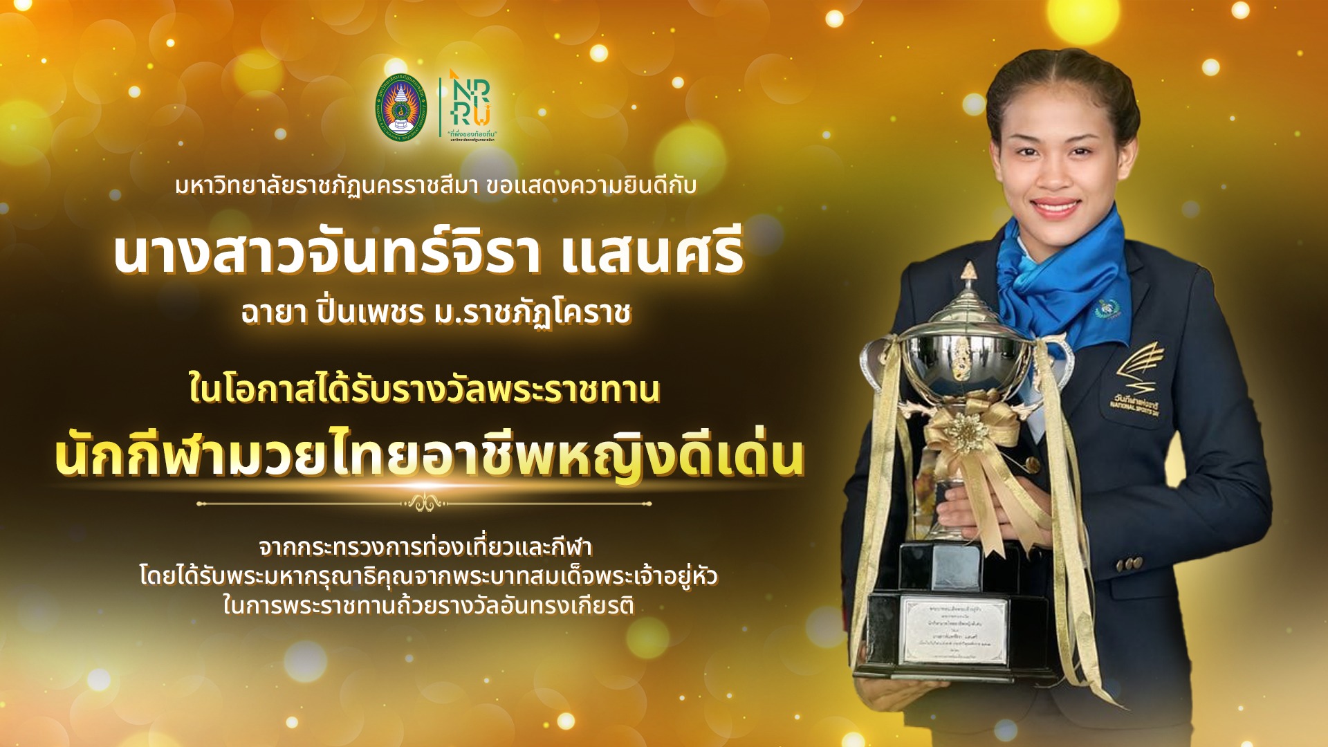 ปิ่นเพชร ม.ราชภัฏโคราช เข้ารับรางวัลพระราชทาน “นักกีฬามวยไทยอาชีพหญิงดีเด่น” ณ ศาลาสหทัยสมาคม ในพระบรมมหาราชวัง
