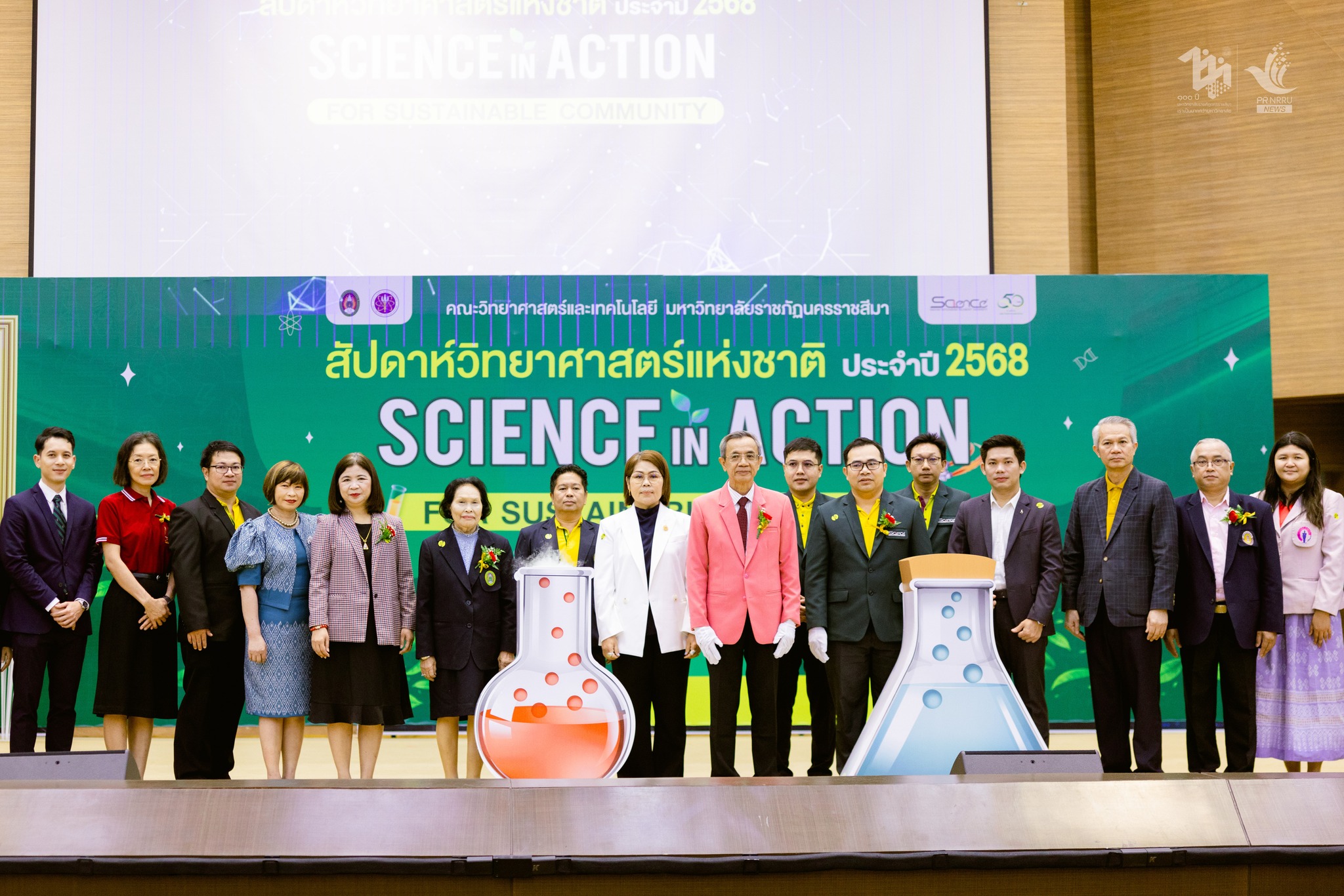 วันที่ 18 สิงหาคม 2568 คณะวิทยาศาสตร์และเทคโนโลยี มหาวิทยาลัยราชภัฏนครราชสีมา จัดพิธีเปิดงานสัปดาห์วิทยาศาสตร์แห่งชาติ ประจำปี 2568 “Science in action for Sustainable Community” ณ หอประชุมราชภัฏรังสฤษฏ์ โดยมี รองศาสตราจารย์ ดร.อดิศร เนาวนนท์ อธิการบดี เป็นประธานในพิธีเปิด พร้อมมอบโล่และใบประกาศเกียรติคุณให้แก่ นักวิทยาศาสตร์อาวุโสและครูวิทยาศาสตร์ดีเด่น ประจำปี 2568จากสมาคมวิทยาศาสตร์แห่งประเทศไทยในพระบรมราชูปถัมภ์ นักวิจัยระดับดีเด่น ดีมาก และดี ผู้สอนดีเด่น ระดับคณะ ประจำปีการศึกษา 2567 ศิษย์เก่าดีเด่น ประจำปีการศึกษา 2568 นอกจากนี้ยังมีการประกวด/แข่งขัน ดังนี้ การแข่งขันกีฬาอีสปอร์ต (E-Sport) การแข่งขันตอบปัญหาทางวิทยาศาสตร์ – คณิตศาสตร์ การแข่งขันวาดภาพจินตนาการทางวิทยาศาสตร์ การแข่งขันทักษะด้านการคิดด้วยการโปรแกรม (Coding) และนวัตกรรม (Innovation) การแข่งขันยิงจรวดขวดน้ำ การแข่งขันการเขียนโปรแกรม Scratch การแข่งขันวาดภาพตามจินตนาการด้วยโปรแกรม Paint การประกวดการแสดงทางวิทยาศาสตร์ (Science Show) และการประกวดโครงงานคณิตศาสตร์-วิทยาศาสตร์ การประกวดชุดรีไซเคิล ฯลฯ . สัปดาห์วิทยาศาสตร์แห่งชาติ ประจำปี 2568 คณะวิทยาศาสตร์และเทคโนโลยี มหาวิทยาลัยราชภัฏนครราชสีมา จัดขึ้นระหว่างวันที่ 18-20 สิงหาคม 2568 ณ มหาวิทยาลัยราชภัฏนครราชสีมา เพื่อส่งเสริมทักษะทางวิทยาศาสตร์ให้กับเยาวชน คณะวิทยาศาสตร์และเทคโนโลยี มหาวิทยาลัยราชภัฏนครราชสีมา เป็นหน่วยงานหนึ่งที่มีหน้าที่ในการให้บริการวิชาการแก่สังคม พัฒนา ปรับปรุงและถ่ายทอดเทคโนโลยีและองค์ความรู้ใหม่ให้แก่ท้องถิ่น จึงจัดงานสัปดาห์วิทยาศาสตร์แห่งชาติขึ้นเป็นประจำทุกปี เพื่อตอบสนองยุทธศาสตร์ใหม่มหาวิทยาลัยราชภัฏ เพื่อการพัฒนาท้องถิ่นตามพระราโชบาย โดยมีการจัดกิจกรรมเพื่อให้นักเรียน นักศึกษา และประชาชนผู้สนใจทั่วไป ได้รับความรู้ทางด้านวิทยาศาสตร์และเทคโนโลยี ซึ่งเป็นการพัฒนาและเสริมสร้างศักยภาพคน อีกทั้งยังเป็นการกระตุ้นสร้างความสนใจให้แก่นักเรียน นักศึกษา ประชาชนผู้สนใจทั่วไปได้ตระหนักถึงความเปลี่ยนแปลง ความก้าวหน้าทางด้านวิทยาศาสตร์